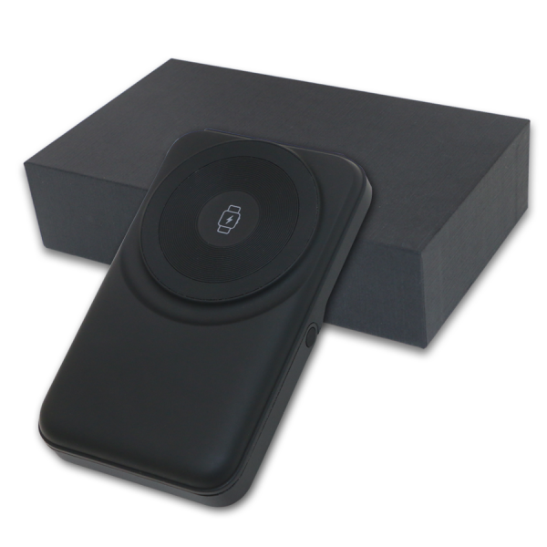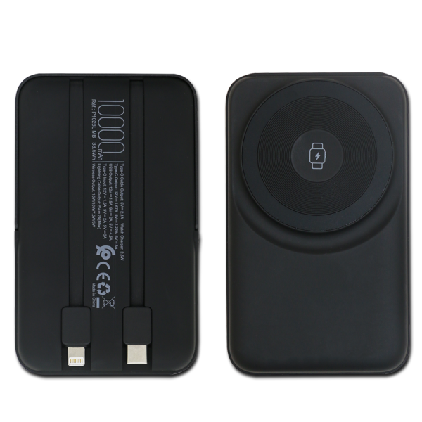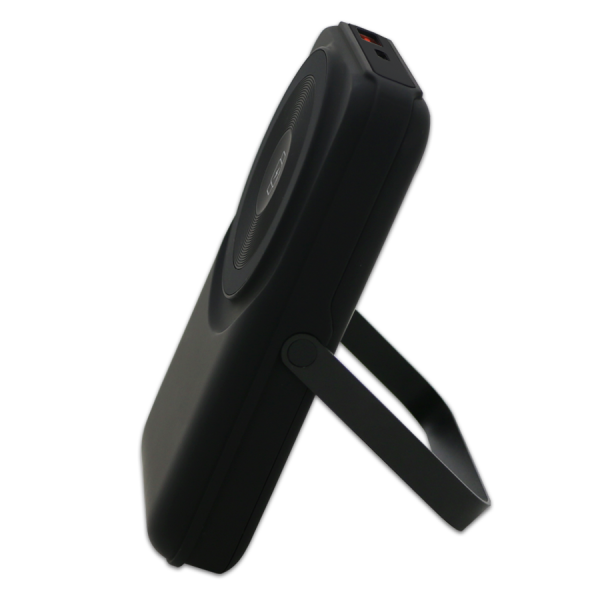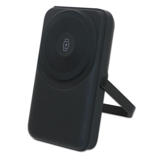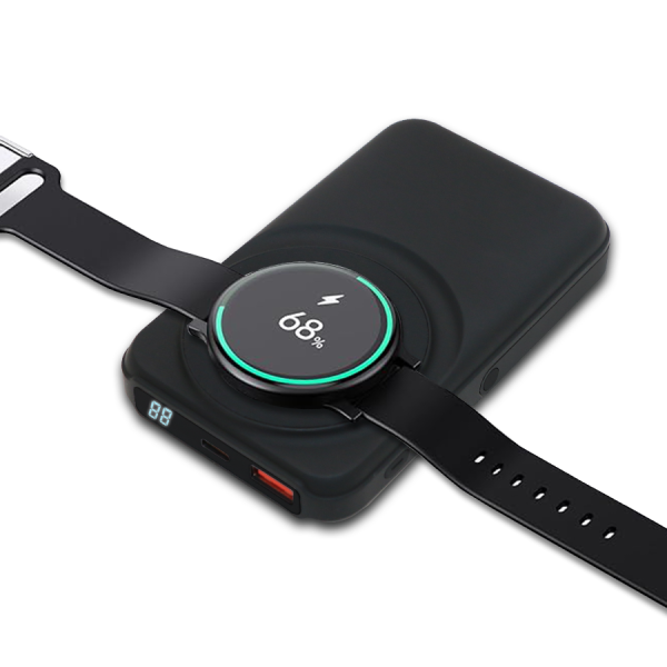 - Description : Batterie de secours 10000 mAh à chargement rapide, compatible téléphone et montre, avec fixation magnétique MagSafe, support intégré et multicâble inclus.