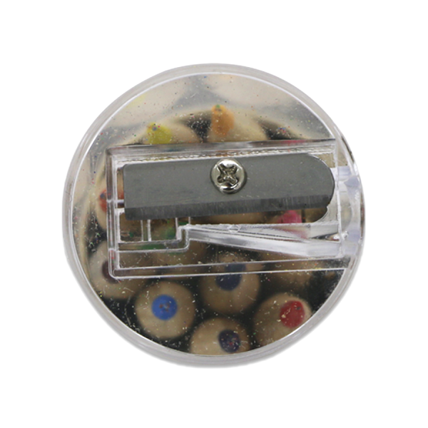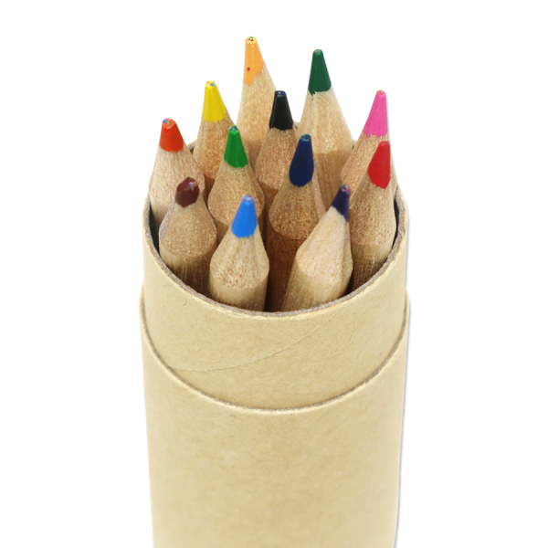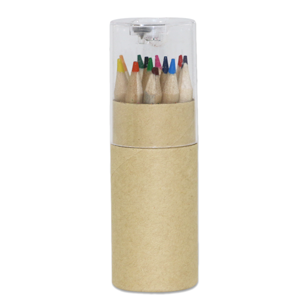 Boite à crayon de couleur en carton composé de 12 pièces de mini crayon en bois en différentes couleurs avec un taille-crayon intégré dans le couvercle