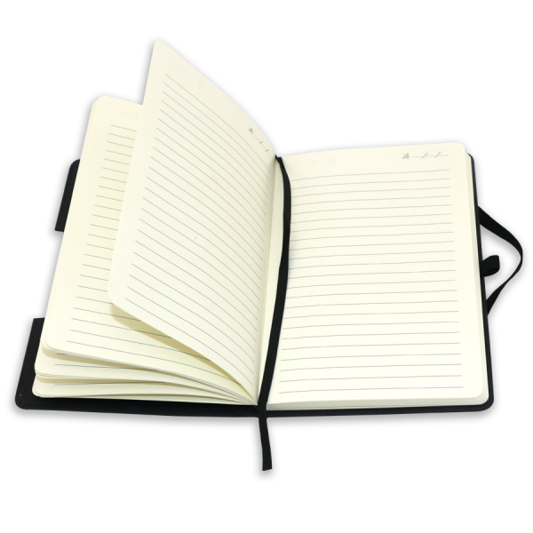 • Intérieur Note Book : 100 feuilles A5 surlignées couleur crème avec pages d’informations et rangement pour stylo