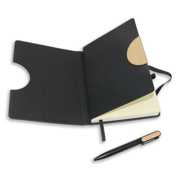 • Type Note Book : Carnet A5 en tissu et bois, fermeture en élastique noir