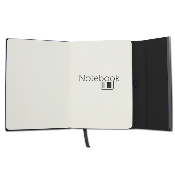 - Un Note book en similicuir effet soft-touch noir / intérieur 100 Feuilles A5 surlignées couleur crème – qualité 80gr/m² avec des pages informations et porte stylo