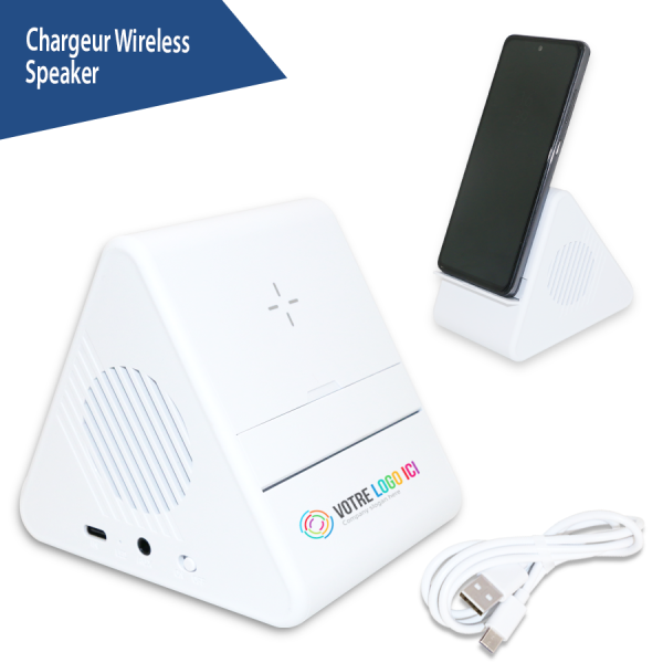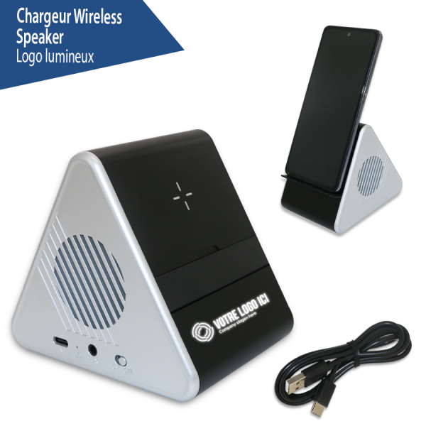 - Détails : Haut-parleur personnalisable forme pyramide 3 en 1 contenant : haut-parleur Bluetooth avec câble inclus, chargeur wireless et porte téléphone