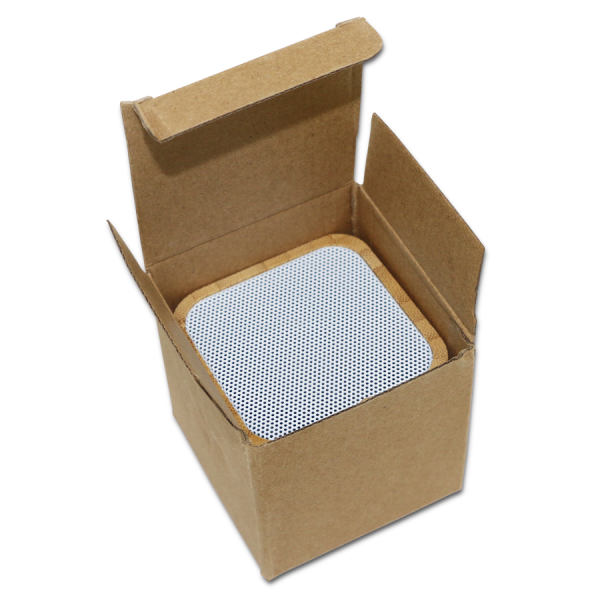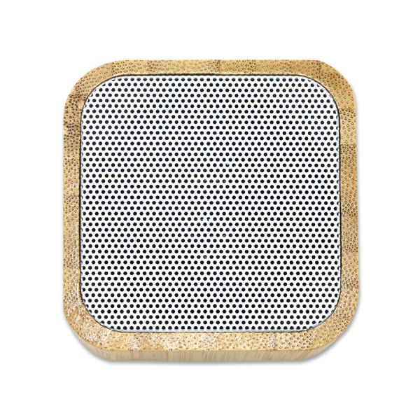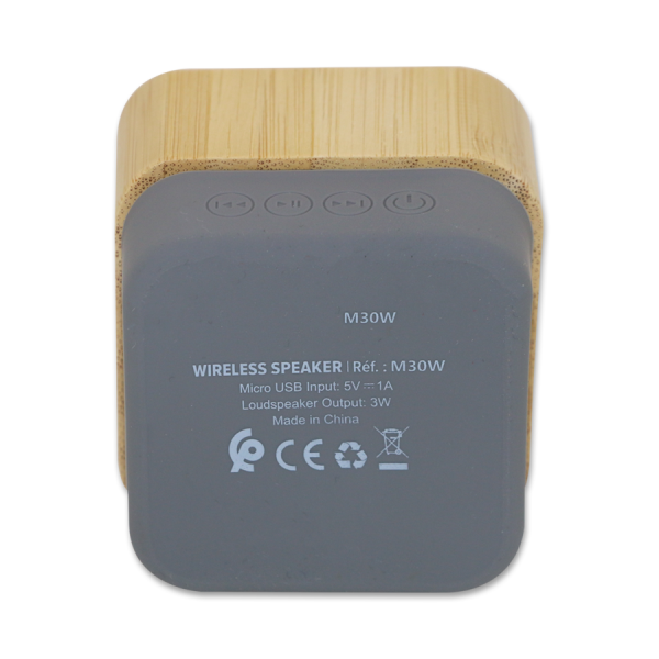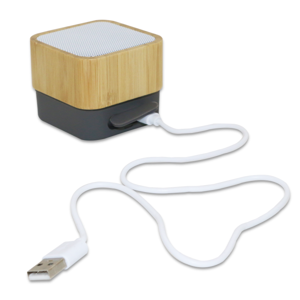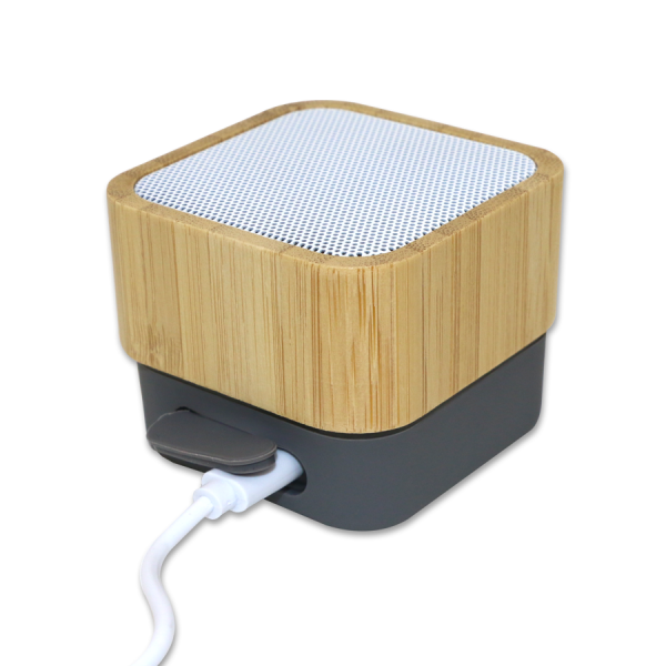 • Détails : Haut-Parleur Bluetooth sans fil en plastique et bambou forme cube avec câbles inclus