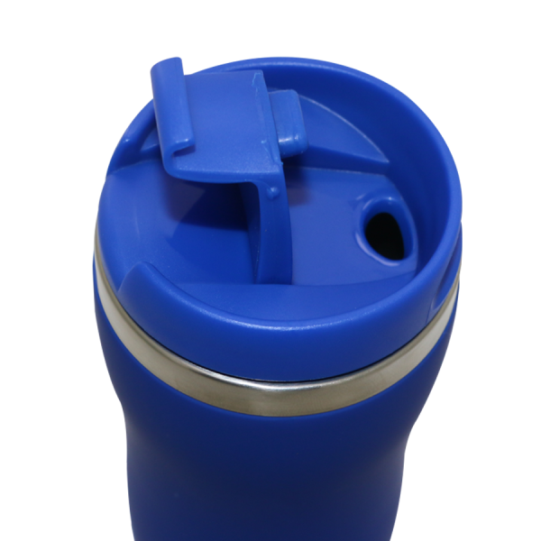 Mug isotherme de haute qualité avec corps en inox et finition soft-touch colorée pour une prise en main confortable.