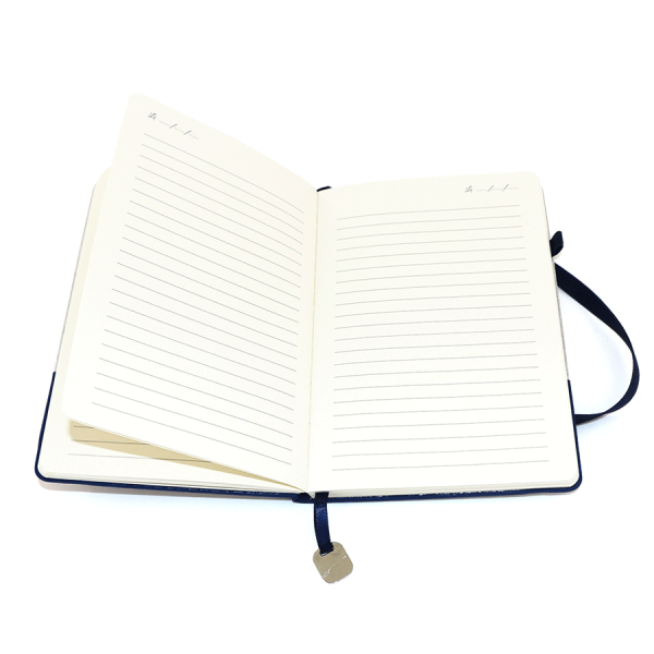 - Intérieur : 100 feuilles A5 surlignées couleur crème avec pages d’informations