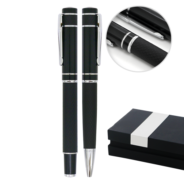 Parure de stylos promotionnelle en métal corps noir et attributs chromés