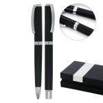 Parure de stylos promotionnelle en métal corps noir et attributs chromés